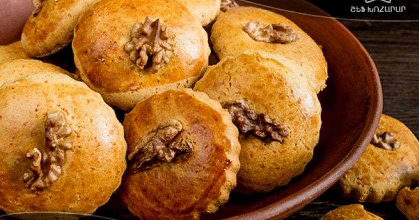 Թխվածքաբլիթները շարում ենք տապակի մեջ, վրան ձու քսում և յուրաքանչյուրի վրա դնում մեկ քառորդ ընկույզ: