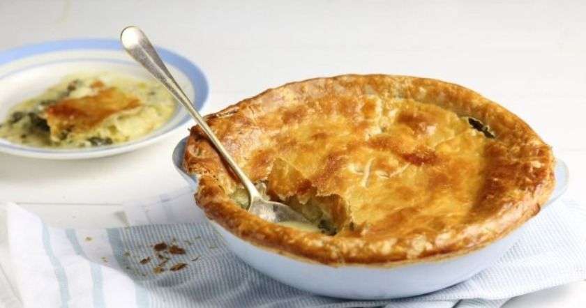 2. Խմորի կեսը լցնել տապակի մեջ, վրան լցնել պահածոյացված ձուկը և մանր կտրատված սոխը, այնուհետև ավելացնել մնացած խմորը: