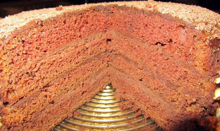 2 ձուն, 190 մլ խտացրած կաթը, 200 գ թթվասերը, 200 գ շաքարավազը լցնել ամանի մեջ, ավելացնել մոտ 300 գ ալյուր (մաղած)՝ 2 թ. գդալ կակաոյի հետ, զանգվածի մեջտեղում փոսիկ անել, լցնել 1 թ. գդալ սոդա, սոդայի վրա կիտրոնի հյութ կամ քացախ լցնել, որ փրփրի: Հարիչով լավ հարել, որ միասեռ զանգված ստացվի: Խմորը բաժանել 2 մասի, հատ-հատ թխել նախապես 180 աստիճան միացրած ջեռոցում 30 րոպե: Թխված 2 բիսկվիտները թողնել, որ սառչեն, յուրաքանչյուրը բաժանել 2 մասի: 100 մլ ջրին 100 գ շաքարավազ ավելացնել, խառնել, 10 րոպե եփել մարմանդ կրակի վրա, հանել կրակից, 2 ճ. գդալ կոնյակ լցնել և սառելուց հետո վրձինով քսել շերտերին: