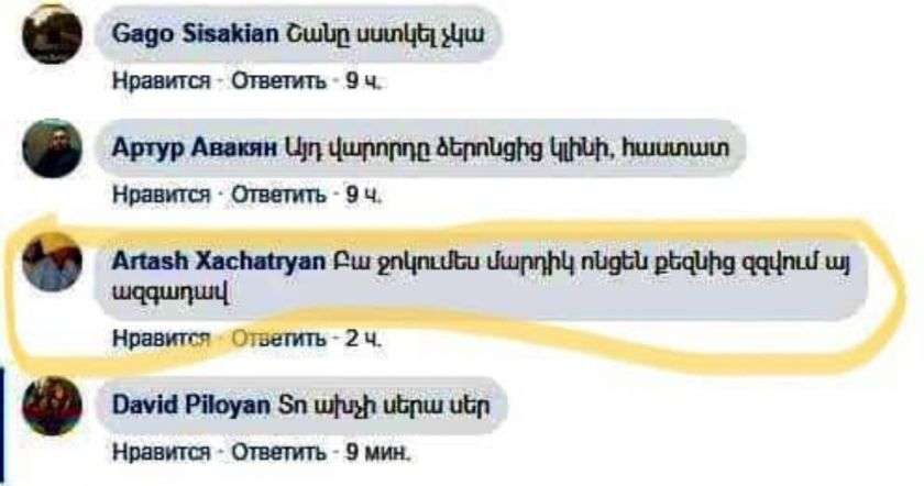 Հայկական ժամանակ օրաթերթի լրագրող Տաթև Խաչատրյանի հոր մեկնաբանությունն է Արփինե Հովհաննիսյանի գրառման տակ: