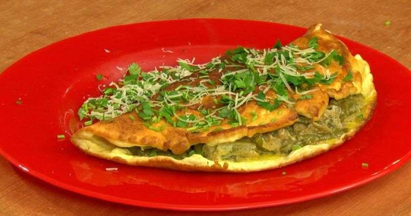 Հարիչի թասի մեջ ջարդել ձվերը, աղ անել, թեթևակի հարել, ապա ավելացնել 60 մլ կաթը, ալյուրը, քերած պարմեզան պանիրը, շարունակել հարել 2-3 րոպե: Պահածոյացված սունկը ջրքամել: Տապակի մեջ կարագ հալեցնել, բարակ շերտատած սոխը տապակել՝ մինչև այն թափանցիկ դառնա, ավելացնել ջրքամած սնկի զանգվածը, տապակել մոտ 5 րոպե: Մեկ այլ տապակի մեջ բուսայուղ տաքացնել, ձվով զանգվածից 2 օմլետ պատրաստել: Սնկի զանգվածին մի քիչ կաթ ավելացնել, համեմել աղ ու պղպեղով, ավելացնել հալեցրած պանիրը, կտրտած մաղադանոսը, կրակն անջատել, թողնել պանիրը հալվի: Պատրաստի օմլետը դնել մատուցվող ափսեի մեջ, մի կեսին սնկով խճողակ դնել, մյուս կեսը վրա բերել, զարդարել կանաչու տերևով. Մատուցել տաք: