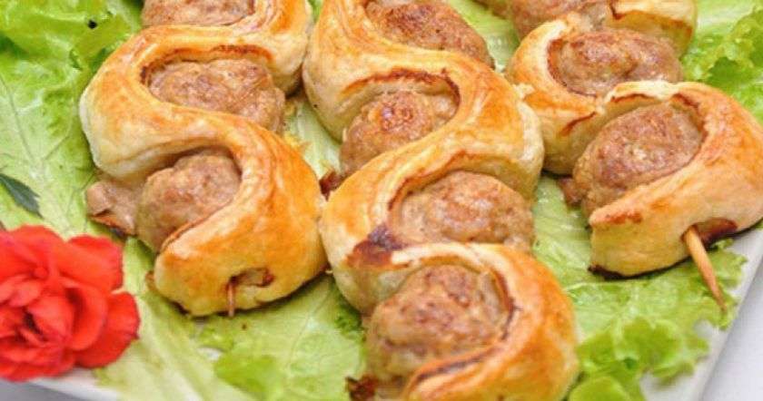 Մինի խորոված հիշեցնող այս ուտեստը պատրաստելու համար կտրատում եք սոխը, լցնում աղացած մսի մեջ, ավելացնում սոյայի սոուսը, պղպեղը, ճզմած սխտորը, լավ խառնում և տեղափոխում սառնարան 30 րոպեով: Այնուհետև մսից ձևավորում ենք 20 հատ կոլոլակ: Բացում ենք պատարստի շերտավոր խմորը ուղղանկյունաձև, կտրատում 5 հատ ժապավենի: Երկար փայտե ձողիկի վրա (որը նախապես թրջում ենք) շարունակական ձևով անցկացնում ենք 1 կոլոլակ, ապա պտտելով անցկացնում խմորից ժապավենը: Նույնը կատարում ենք մնացած կոլոլակների հետ: Ամեն փայտիկի վրա անցկացնում ենք 4 հատ կոլոլակ: Խմորի երևացող հատվածների վրա քսում ենք հարված դեղնուց: Եփում ենք ջեռոցում 30-40 րոպե 180 աստիճանում բուսայուղով պատված տապակի մեջ: Պատրաստի ուտեստը տեղավորում ենք հազարի թերթերով պատված ափսեի մեջ և մատուցում: