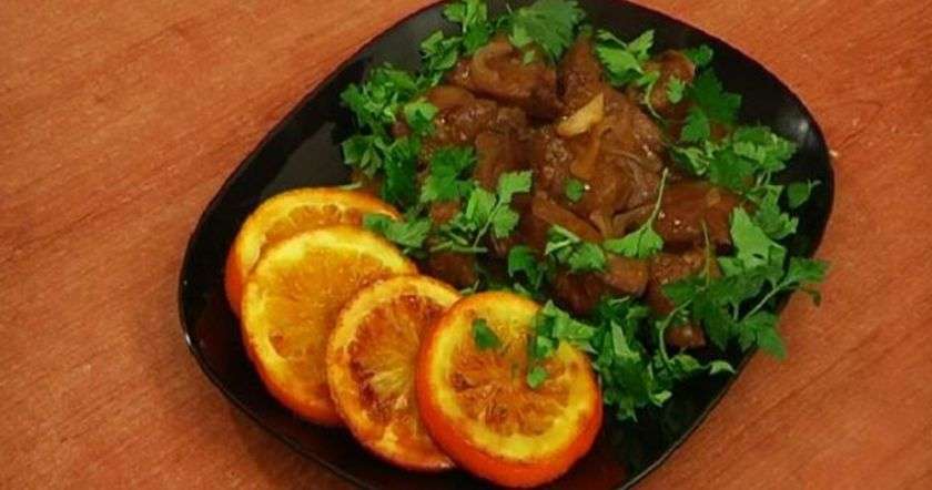 Տապակի մեջ կարագ հալեցնել, ավելացնել շաքարավազը, խառնել՝ մինչև շաքարավազը հալվի: Նարինջն, առանց կլպելու, շրջանաձև կտրել 1 սմ հաստության շերտերի, դրանք տապակել՝ մինչև սկսեն կարամելիզացվեն, յուղի հետ տեղափոխել ափսեի մեջ: Սննդային տոպրակի մեջ լցնել ալյուրը, կարմիր պղպեղը, խառնել: Լյարդի թաղանթը հեռացնել, շերտատել, լցնել պղպեղով համեմված ալյուրով տոպրակի մեջ թափահարել, որպեսզի լյարդի կտորները հավասարաչափ ալրապատվեն: Տապակի մեջ բուսայուղ տաքացնել, լյարդի կտորները տապակել, հանել ափսեի մեջ, աղ անել: Կիսած ու շերտատած սոխը նույն յուղով տապակել՝ ավելացնել արգանակը, հասցնել եռման աստիճանի, մեջը լցնել տապակած լյարդի կտորները, կափարիչ դնել, եփել 5 րոպե, ապա ավելացնել մանանեխը, նարինջն իր յուղով, վրան կտրտած մաղադանոս շաղ տալ և կրակից վերցնել: