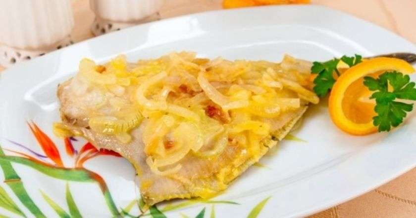 Սոխը կիսալուսնաձև կտրատել: Նարնջի հյութը քամել: Բուսական յուղի մեջ տապակել սոխը: Ավելացնել ձուկ,աղ, պղպղեղ, տապակել յուրաքանչյուր կողմից 5 րոպե: Ավելացնել հյութը, շոգեխաշել 10 րոպե:
