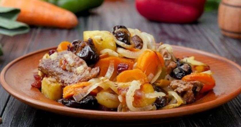 4. Միսը դնել տապակի մեջ, ավելացնել կարտոֆիլը, համեմել աղով, վրան լցնել գազարը, շաքարավազ շաղ տալ, հաջորդիվ շարել չրերը, վերևից՝ տապակած սոխը: