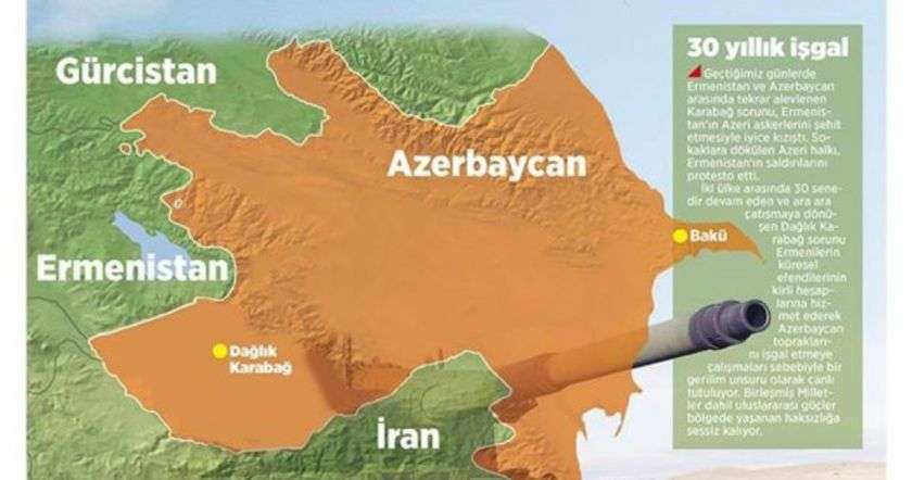 Թուրքական Diriliş Postası թերթի շապիկը՝ «Ղարաբաղ կամ մահ» վերտառությամբ։ Քարտեզում, Արցախից բացի, ոչ միայն Սյունիքն է Ադրբեջանի կազմում, այլ գրեթե ողջ Վայոց Ձորը՝ ներառյալ Եղեգնաձորը, Վայքն ու Ջերմուկը։