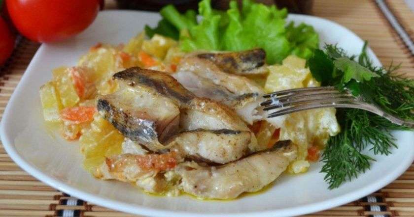 Ձուկը երկու մասի բաժանել, աղ, պղպեղ անել, թավալել ալյուրի մեջ: Տապակել բուսյաուղի մեջ ամեն կողմից երկու րոպե: Լոլիկները եռացած ջրի մեջ գցել, կեղևը հանել, կիսել: Վրան աղ ցանել և տապակել կիսած սխտորի հետ: Տապակի մեջ շերտերով շարել ձուկը, կտրատած կանաչին, լոլիկները: Պանիրը քերել և լցնել լոլիկի վրա: Եփել 160-180 աստիճան ջեռոցում 15-20 րոպե: Մատուցել ` զարդարելով կանաչիով: