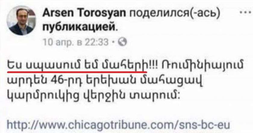 Իմ միամիտ ժողովուրդ, քեզ խաբել են, իսկ քեզ բուժող ու կյանքդ փրկող բուժաշխատողին վախեցրել են ու շանտաժի են ենթարկում... Ցավում եմ դրա համար, բայց դա է իրականությունը: