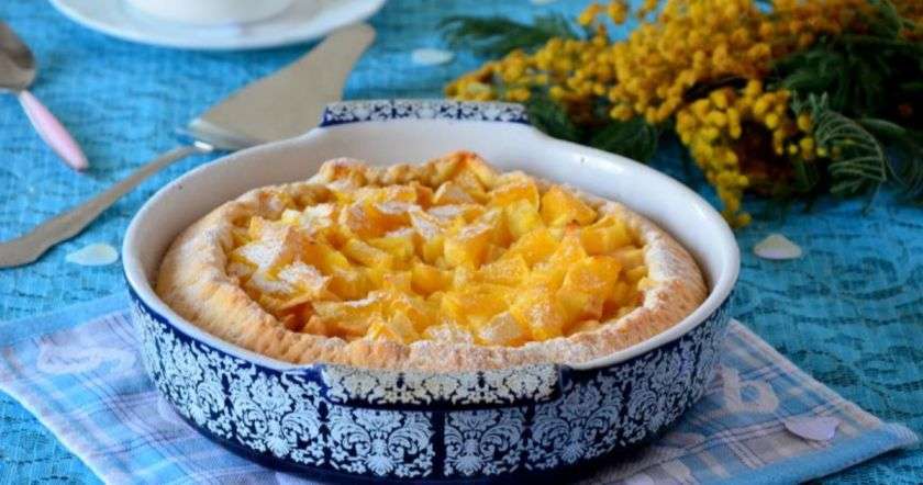 - Մաքրել և խորանարդաձև կտրատել խնձորն ու նարինջը, լցնել խմորի վրա, ցանել շաքարի փոշին։