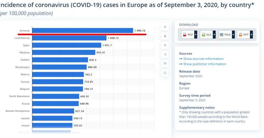 Կից նյութն այստեղ՝ Incidence of coronavirus (COVID-19) cases in Europe as of September 3, 2020, by country*