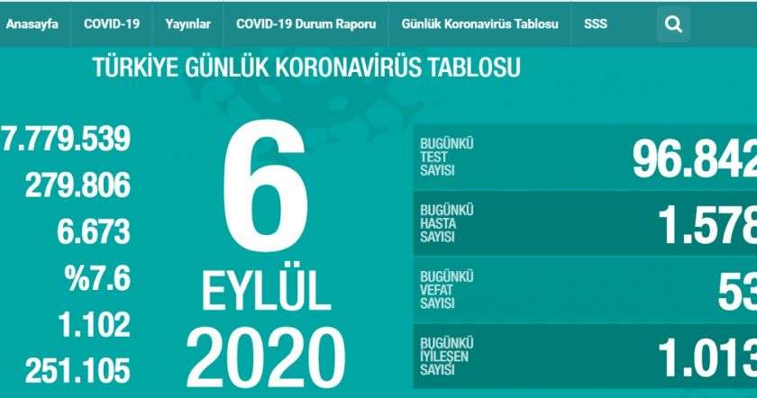 Կորոնավիրուսի հետ կապված տեղեկատվությունը հաղորդելու համար ստեղծված կայքից էլ տեղեկանում ենք, որ Թուրքիայում վերջին 1 օրվա ընթացքում 1 օրում անցկացված 96․842 թեստի արդյունքում գրանցվել է վարակի 1578 նոր դեպք: 24 ժամում մահերի թիվը հասել է 53-ի, ինչը վերջին շաբաթների ամենամեծ թիվն է: