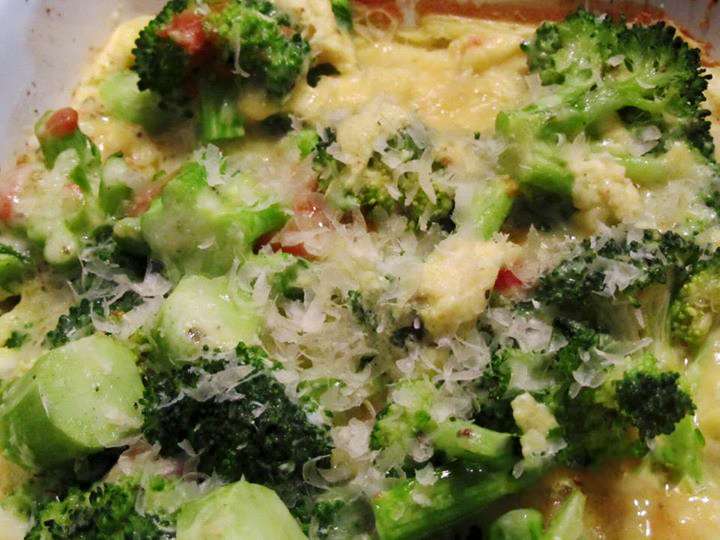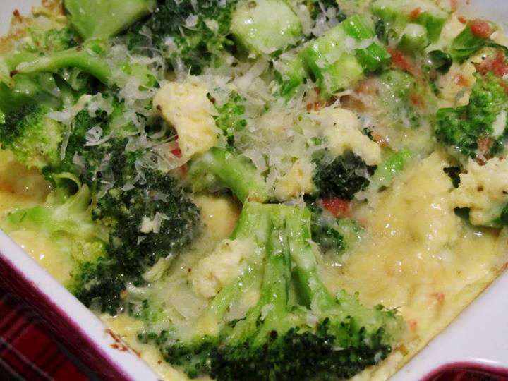 Բրոկոլին բաժանել մասերի, լվանալ և 2 րոպե եփել եռացող աղաջրի մեջ, ջրքամել: Ջեռոցի տապակին ձեթ քսել, լցնել բրոկոլին, աղ, սև պղպեղ, համեմի սերմ, քերած պանիր ավելացնել, 2 ձուն 200 մլ (500 գ բրոկոլիի դեպքում) կաթի հետ հարել և լցնել բրոկոլիի վրա:
