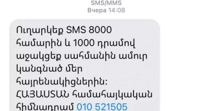 Ժող, սա իսկական հիմնադրամի գումար հավաքելու SMS-ն ա։ Ինչ-որ մարդիկ տարածում են, թե սա ֆեյք ա։ Բայց տենց չէ, իրական ա։ Ճշտված է հիմնադրամի տնօրեն Haykak Arshamyan-ից։ Հանգիստ օգտվեք։