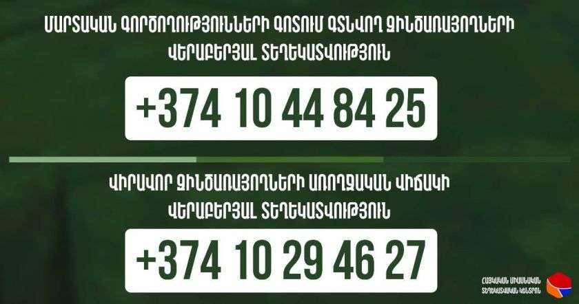 Վիրավոր զինծառայողների առողջական վիճակի հետ կապված հարցերի պարզաբանումների համար գործում է +374 10 29-46-27 հեռախոսահամարը: