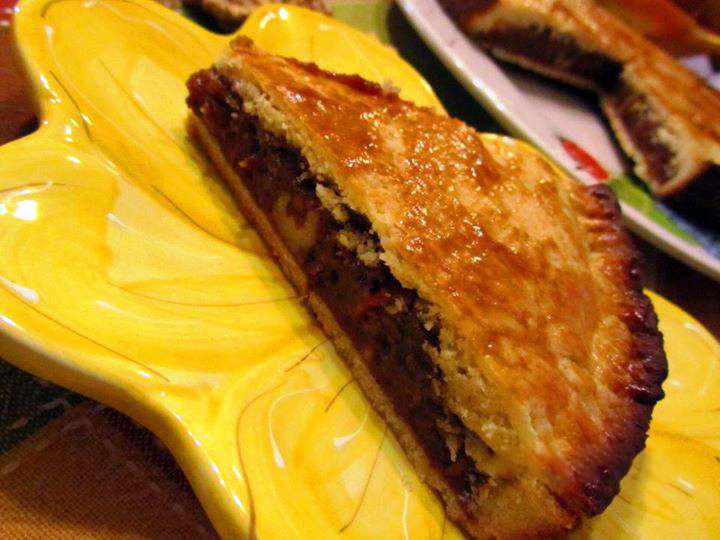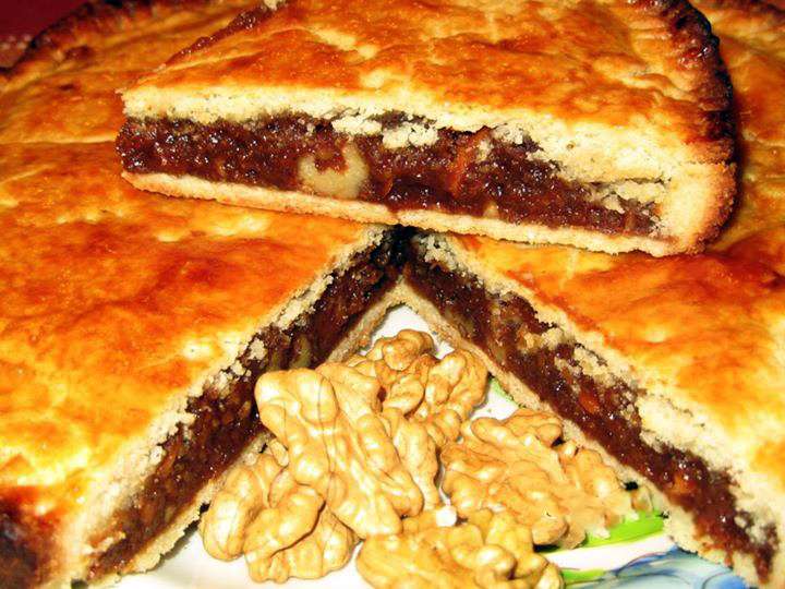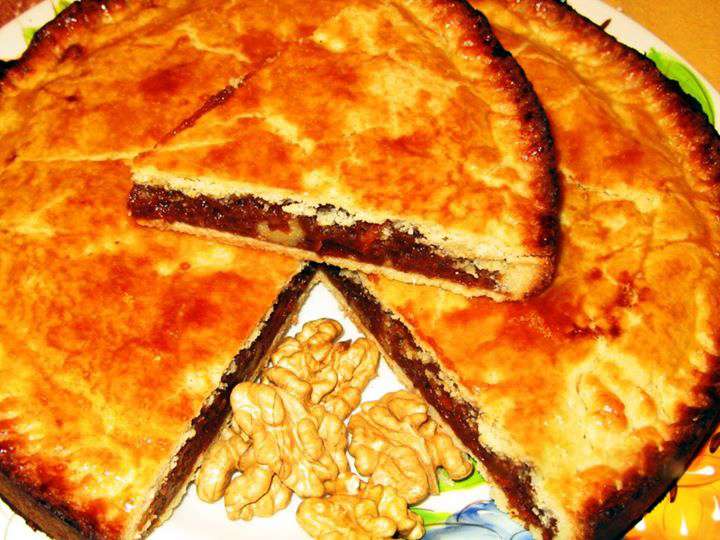 250 գ ընկույզը մանր կտրատել, կաթսայի մեջ լցնել 100 գ շաքարավազ և դնել կրակին, փայտե գդալով խառնել, շաքարավազը կսկսի հալչել, հենց ողջ շաքարավազը հալչի ու մի փոքր շագանակագույն դառնա, ավելացնել ընկույզը, լավ խառնել, որ պատվի կարամելով, ավելացնել 2 ճ. գդալ մեղր, 100 մլ 10% յուղայնությամբ սերուցք, եռացնել՝ անընդհատ խառնելով (2-3 րոպե), վերցնել կրակից: Խմորը բաժանել 2 մասի, մի մասը գրտնակել, տեղավորել ջեռոցի կլոր ամանի մեջ, խմորին տալ ամանի տեսքը, պատառաքաղով մի քանի տեղից ծակծկել, մեջը լցնել գոլ միջուկը, ծածկել խմորի մյուս մասով, ծայրերը ամրացնել, վրան դեղնուց քսել և թխել նախապես 180 (350F) աստիճան միացրած ջեռոցում 30-40 րոպե կամ մինչև կարմրելը: Ավելի է համեղանում հաջորդ օրը: Բարի ախորժակ :)