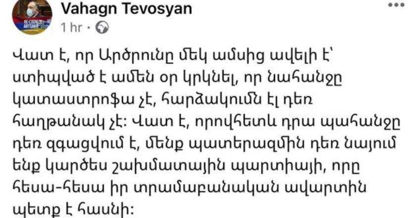 …ու դուք՝ դեգեներատներդ, փոխանակ անասնագույն ստատուսներ գրեք, պիտի միջազգային մամուլի առաջին էջերից չիջնեիք ու կառույցների դռները ջարդեիք՝ աշխարհին հասցնելով, որ թուրքը քիմիական զենք ա օգտագործում Արցախում, որ խաղաղ բնակիչ ա սպանում ու գլխատում: