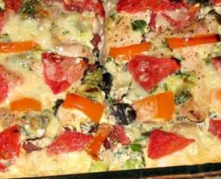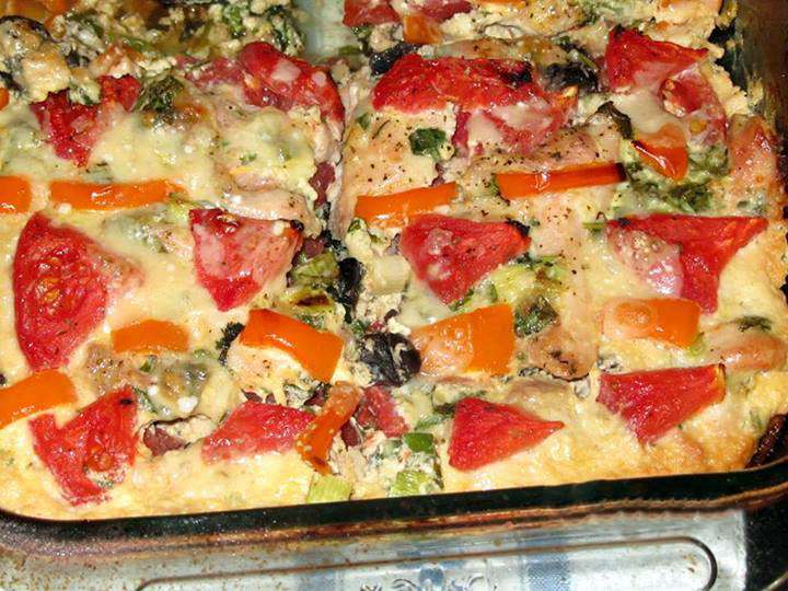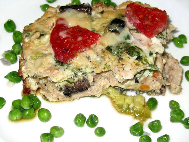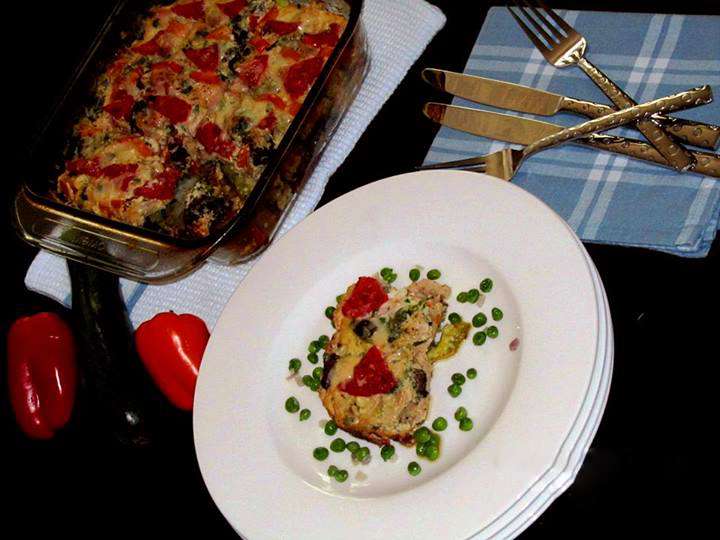 300 գ հավի փափկամիսը լվանալ, երկարությամբ կտրատել: 2 ձուն, 4 ճ գդալ թանձր թթվասերը, 3 հատ կանաչ սոխը, համեմը, մաղադանոսը (կանաչիները կտրատել) խառնել իրար, ավելացնել աղ, սև պղպեղ, խառնել, այս զանգվածը լցնել մսի վրա, 1 ժամով միսը թողնել սառնարանում: 200 գ սունկը մաքրել, լվանալ, կտրատել և տապակել՝ քիչ աղ, սև պղպեղ և համեմի սերմ ավելացնելով (սնկի փոխարեն կարող եք սմբուկ վերցնել, նախապես կտրատել, աղ անել և մոտ 20 րոպե թողնել, որ դառնությունը դուրս գա, տապակելով կիսաեփ անել): 1 հատ դդմիկը լվանալ, եթե ուզում եք, կարող եք կեղևահանել, կտրատել շրջանաձև, 2 հատ լոլիկը լվանալ, կտրատել շրջանաձև կամ կիսաշրջանաձև: Ջեռոցի տապակին ձեթ քսել, դասավորել կտրատած դդմիկները, քիչ աղ անել, վրան լցնել մսի մի մասը, հետո լոլիկի մի մասը, սունկը, մսի մյուս մասը, վերջում դասավորել լոլիկները (ես նաև քաղցր պղպեղ եմ ավելացրել): Եփել նախապես 180 (350F) աստիճան միացրած ջեռոցում մոտ 40 րոպե: Բարի ախորժակ :)