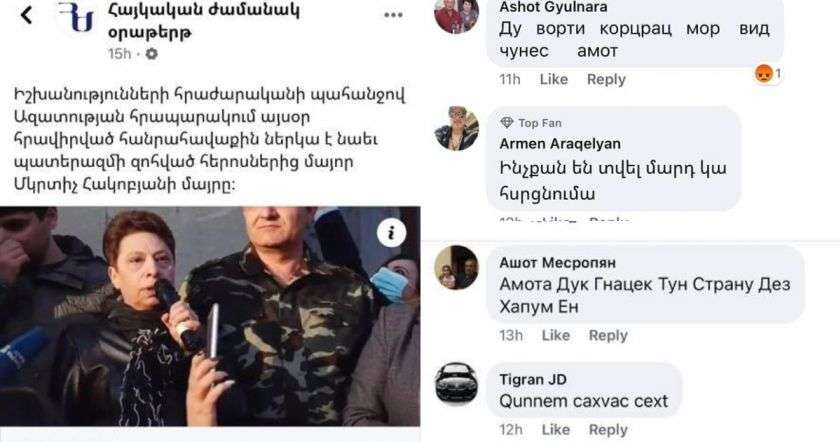 Նիկոլ Փաշինյանի «Հայկական ժամանակ»-ը Ֆեյսբուքում տեղադրել է երեկվա հանրահավաքի ժամանակ ելույթ ունեցող որդեկորույս մոր մասին ելույթը ու տակը ֆեյքերը ՀԱՅՀՈՅՈՒՄ ԵՆ ՆՐԱՆ: