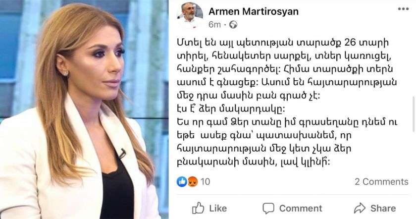 Այս ոմն հանրային անձը, ով բարոյապես ոչնչացվելուց հետո ջնջեց ստորեւ ներկայացված գրառումը, գտնում է, որ մեր պատմական հողերն այլ պետության տարածք են, ուր հայը նենգաբար մտել է։