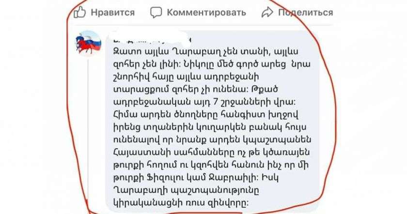 Ու էն, որ մի ապուշ մանիպուլյացիա են անում՝ մեկ ա, տված էին էդ հողերը, Նիկոլի վզին մնաց սաղ, դա հենց նման մասսայի համար եփված կերակուր ա, որ կարողանան արդարացնեն փնթի կառավարման արդյունքում զգետնված պետության և նրա իշխանության թշվառությունը...