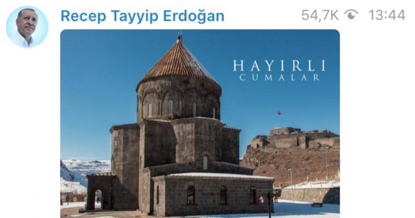 Թուրքիայի նախագահ Էրդողանն իր թելեգրամյան պաշտոնական ալիքում գրառում է կատարել, որում տեղադրել է բերդաքաղաք Կարսի հայկական Սբ. Առաքելոց վանքի նկարը։ Վանքն այժմ ծառայում է որպես քաղաքային մզկիթ։ Էրդողանն իսլամական ավանդույթով շնորհավորել է մուսուլմանների հանգստյան օրը՝ ուրբաթը։