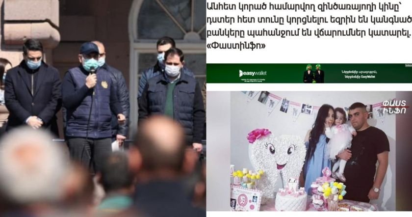 Մինչ փաշինյանը զբաղված է Արմավիրի մարզում փախեփախ անելով և իբր բնակիչների հետ հանդիպելով՝ Էջմիածնում անհետ կորած զինծառայողի ընտանիքը կանգնած է բնակարանը կորցնելու եզրին։ Պետությունը բառացիորեն ոչինչ չի արել էս ընտանիքի համար, իսկ բանկերը ընդառաջել են որքանով կարող են։