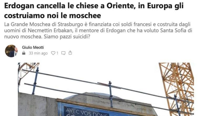 Էրդողանը Արևելքում վերացնում է եկեղեցիները, Եվրոպայում մենք ենք նրա համար մզկիթներ կառուցում: Իտալիայում Հայաստանի դեսպանության փոխանցմամբ՝ այս մասին գրել է իտալացի լրագրող Ջուլիո Մեոտտին։
