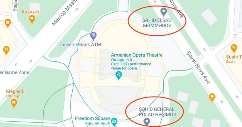Varoojan Khodabakhshianը երեկ նկատեց, որ Google Maps-ի քարտեզներում Երևանի փողոցները ադրբեջանցիներն անվանափոխում են իրենց բանակի հերոսների անունով (տե՛ս կից նկարը)։