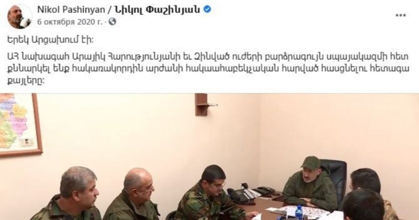 * Փաշինյանը ռազմական գործողության մասին հոկտեմբերի 6-ին գրառում անելուց տեղադրել է լուսանկար, որտեղ երեւում են՝