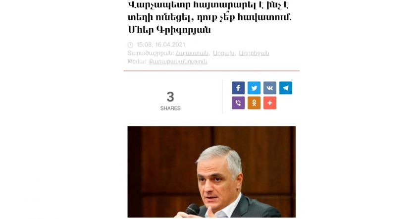 Նենց էլ բերանը լիքն ասում ա "վարչապետն ա ասում` չե՞ք հավատում"։ Դրա ինչի՞ն հավատաս, խի ո՞ր մի ասածն ա ճիշտ եղել, որ դրան էլ հավատան։ Շարքային ցինիկ մուտիլովշիկ, չէ մի չէ` վարչապետ։