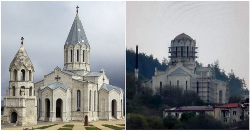 Շուշիի Սուրբ Ամենափրկիչ Ղազանչեցոց եկեղեցու արտաքին տեսքը հիմա։ Մի քանի օր առաջ հանել էին 4 հրեշտակների արձանները, անհետացրել եկեղեցու բակում դրված խաչքարը, իսկ այսօր տեսնում ենք, որ քանդել են գմբեթը ...