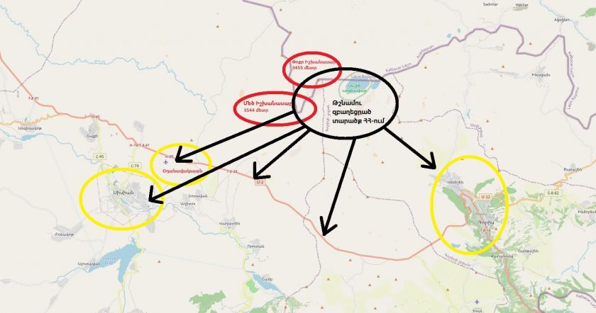 Սև սլաքներով նշել եմ այն տարածքները և ենթակառուցվածքները (միջպետական մայրուղի, օդանավակայան), որոնք տվյալ հատվածից ընկնում են թշնամու դիտարկման և ուղիղ նշանառության տակ։