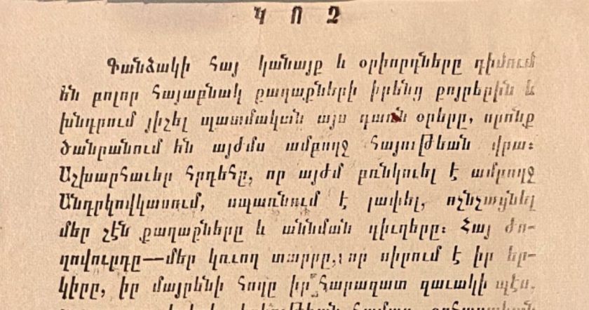 Ուշադիր կարդացեք Գանձակի հայուհիների այս թռուցիկ-նամակը։ Այն գրվել է 1906 թ․ հունվարի 20-ին, երբ թաթար խաժումուժը հրահրվում էր Բաքվի, Շուշիի, Գանձակի, Երևանի Նախիջևանի ու Թիֆլիսի հայության դեմ։