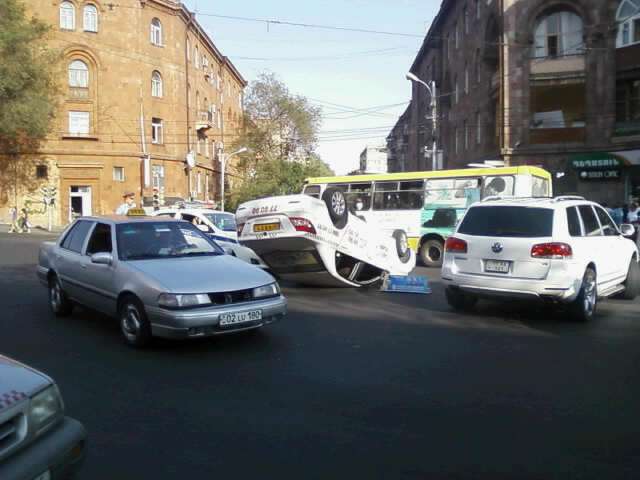 Կիևյան-Օրբելի խաչմերուկում լուրջ ավտովթար է տեղի ունեցել: «Նոր» տաքսի ծառայության մեքենան բախվել է մեկ այլ տաքսու և շուռ է եկել հենց խաչմերուկի մեջտեղում: Շուռ եկած մեքենայի վարորդը թեթև մարմնական վնասվածքներ էր ստացել: Դեպքի վայր են ժամանել ոստիկաններ ու շտապ օգնության մեքենան: