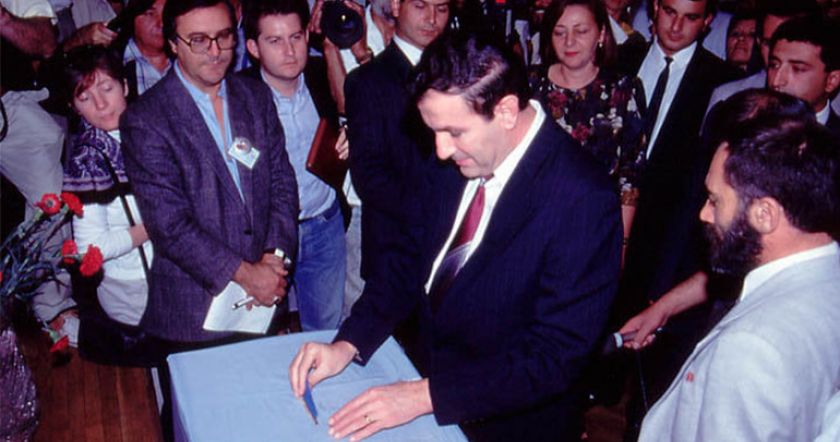 Լուսանկարում` Հայաստանի Գերագույն խորհրդի նախագահ Լևոն Տեր-Պետրոսյանը մասնակցում է Անկախության հանրաքվեին (21.09.1991թ):