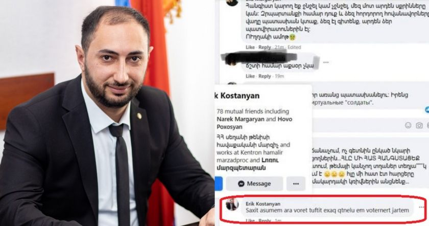 Այս անգամ Փաշինյանի թիմակցի թիրախում է հայտնվել վանաձորցի բնապահպան Հակոբ Միկոյանը։ Բնապահպանն իր էջում հրապարակել է  իշխող թիմի նախընտրական պաստառ, որը գետնին  է նետված, որին ի պատասխան Լոռու մարզպետի օգնական Էրիկ Կոստանյանը գրել է․ «Սաղիդ ասում եմ, արա որդ տուֆտիտ եղաք, գտնելու եմ ոտերներդ ջարդեմ»։