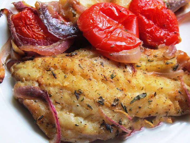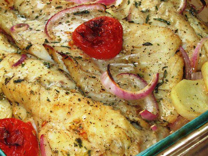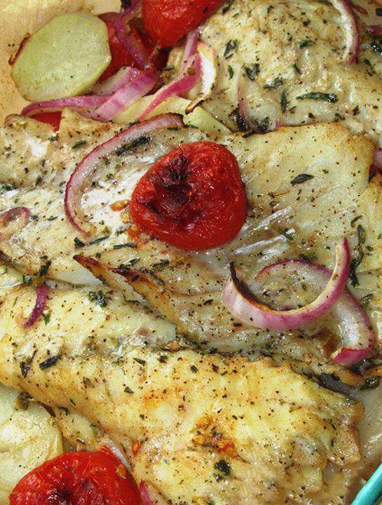 500 գ ձկան ֆիլեն (ցանկալի է սպիտակ) լվանալ, չորացնել, աղ, սև պղպեղ ցանել, չորացրած թարխուն, ծիտրոն փշրել վրան: 1 հատ կարմիր գլուխ սոխը կիսալուսնաձև կտրատել, 300 գ լոլիկը լվանալ, եթե մեծ են, կտրատել, եթե մանր լոլիկներ են (cherry tomatoes), հենց այդպես թողնել, ջեռոցի տապակի մեջ տեղավորել սոխը, լոլիկը, չոր հացի կտորներ կամ շատ բարակ կտրատած 2 հատ ոչ մեծ կարտոֆիլ, 2 պճեղ սխտոր կտրատել, այս ամենի վրա լցնել կես կիտրոնի հյութ, 4-5 ճ. գդալ զեյթունի ձեթ, ծիտրոն, օրեգանո, աղ, սև պղպեղ, լավ խառնել, ավելացնել ձկան ֆիլեն, նորից խառնել: 20 րոպեով տեղափոխել նախապես 220 (450F) աստիճան միացրած ջեռոց: Բարի ախորժակ :)