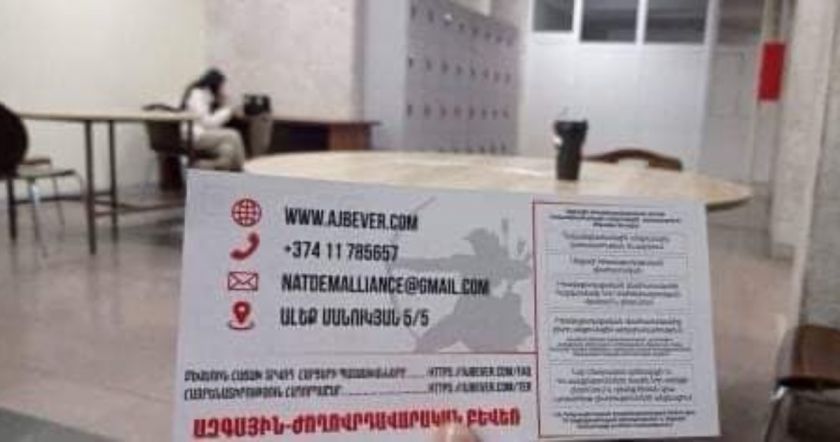 Եւ ահա բուհերի քաղաքականացման դեմ ծրագրի շրջանակներում այսօր մայր բուհն ու նրա գրադարանը զարդարվել էին ԱԺԿ քաղաքական կառույցի թռուցիկներով։