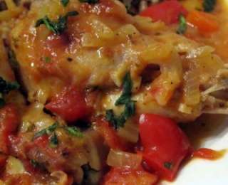 1200-1400 գ հավի միսը (ես բդիկներով եմ պատրաստել) լվանալ, չորացնել, աղ ու սև պղպեղ անել, լավ թավալել ալյուրի մեջ, տապակել մինչև կարմրելը, հանել տապակից, դնել մի կողմ: 1 հատ քաղցր պղպեղը, 1 գլուխ սոխը, 3 պճեղ սխտորը կտրատել, կաթսայի մեջ տապակել (ցանկալի է կաթսան հաստ պատեր ու հատակ ունենա, որ տապակվելիս ոչինչ չայրվի) մինչև փափկելը, ավելացնել 3/4 բաժակ սպիտակ չոր գինի, եփել մոտ 5 րոպե, ավեացնել 3/4 բաժակ հավի կամ բանջարեղենային արգանակ, 500 գ մաքրած, կտրատած լոլիկ (կարելի է օգտագործել պահածոյացված լոլիկ առանց հավելումների սեփական հյութի մեջ), 1 թ. գդալ չորացրած օրեգանո կամ ուրց, աղ, սև պղպեղ, տապակված հավի միսը տեղափոխել սոուսի մեջ, հենց սկսի եռալ, ցածրացնել կրակը և եփել մոտ կես ժամ, մինչև հավի պատրաստ լինելը: Եթե սոուսն այդ ընթացքում չի պնդանում, հավի միսը հանել և թողնել, որ սոուսը եռա, մինչև որոշակի թանձրության հասնելը: Մատուցել ցանկացած փլավի հետ: Բարի ախորժակ :)