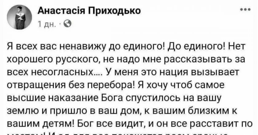 Возможно, это изображение 3 человека и текст «анастася приходько 1 дн. я всех вас ненавижу до единого! до единого! нет хорошего русского, не надо мне рассказывать за всех несогласных.... y меня это нация вызывает отвращения без перебора! я хочу чтоб самое высшие наказание бога спустилось на вашу землю и пришло в ваш дом, к вашим близким к вашим детям! бог все видит, и он все расставит по местам! и ад для вас покажется раем сраные ублюдки!»