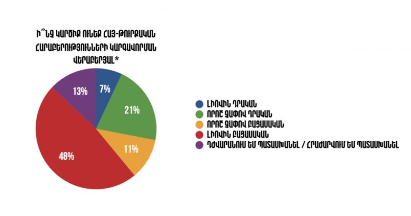 «Ի՞նչ կարծիք ունեք հայ-թուրքական հարաբերությունների կարգավորման վերաբերյալ» հարցին մեր երկրի բնակչության մեծամասնությունը՝ (շուրջ 60%-ը) պատասխանել է, որ ունի բացասական կարծիք, այսինքն՝ դեմ է այդ փաստացի կապիտուլիացիոն գործընթացին։ Միանշանակ դրական է տրամադրված ընդամենը 7%-ը, որն էլ իր հերթին հետևողական քարոզի արդյունք է, որ վարվում է օրնիբուն պետական և իշխանական ռեսուրսներով։