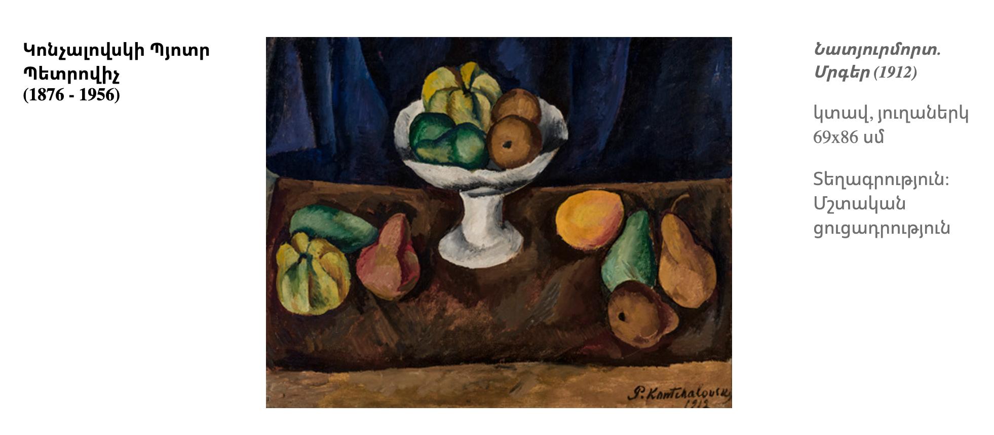 Պյոտր Կոնչալովսկի, 1876-1956, «Նատյուրմորտ մրգերով», 1912թ. կտավ, յուղաներկ, ապահովագրական արժեք՝ 3 500 000 եվրո: