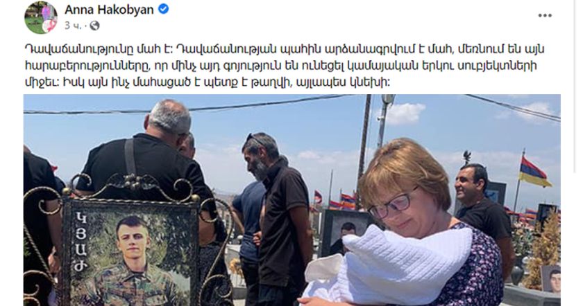 աննան էս նկարը միայն մեկ դեպքում կարար պոստ աներ. երբ ինքնախոստովանական ցուցմունք կտար, ու կասեր՝ տեսեք, թե ինչ օրի ենք հասցրել մենք այս ընտանիքին, խլել ենք, մահվան ենք ուղարկել իրենց մի որդուն, բայց իրենք ուժ են գտել իրենց մեջ ու այս երկրի համար նոր զավակ են լույս աշխարհ բերել։