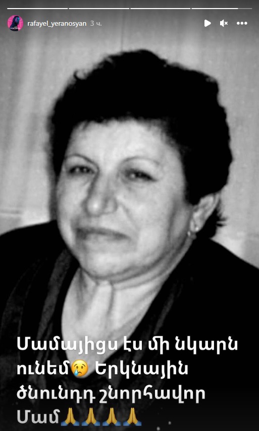 Դերասան և հաղորդավար Ռաֆայել Երանոսյանը հրապարակել է իր մայրիկից մնացած միակ լուսանկարը, որին կից գրել է. «Մայրիկիցս այս մի նկարն ունեմ: Շնորհավոր երկնային ծնունդդ, մա՛մ»: