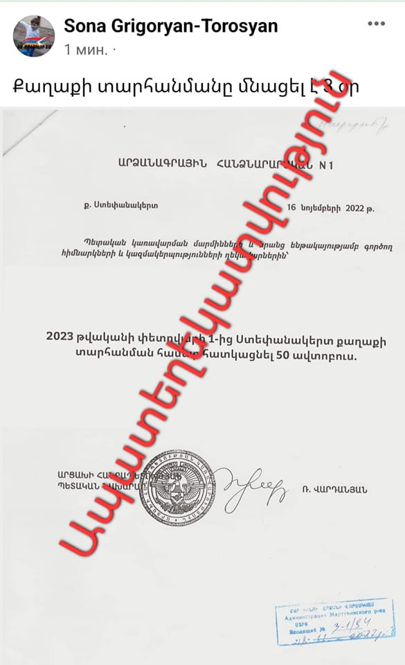 Ստեփանակերտ քաղաքի բնակիչներին տարհանելու համար ավտոբուսներ հատկացնելու վերաբերյալ կեղծ փաստաթուղթ են տարածում՝ նպատակ ունենալով խուճապ տարածել բնակչության շրջանում։