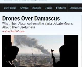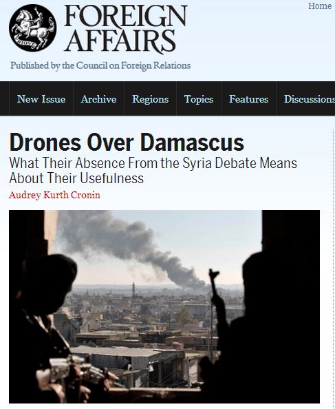 Սեպտեմբերի 2-ին այս պարբերականի կայքում հրապարակված հոդվածում, որը վերնագրված է «Անօդաչու սարքերը Դամասկոսի վրա», հանդիպում ենք մի շարք անհիմն պնդումներ, որոնք հարիր չեն լուրջ համարվող այնպիսի պարբերականի, ինչպիսին է «Foreign Affairs»-ը:
