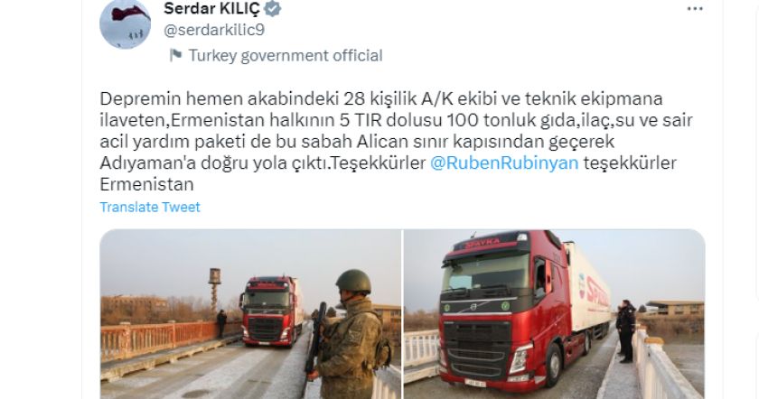Թուրքիա օգնություն ուղարկելուն ի պատասխան հայ-թուրքական կարգավորման հարցերով Անկարայի հատուկ ներկայացուցիչը՝ թուրք դիվանագետ Սերդար Քիլիչը, Թվիթերում շնորհակալություն է հայտնել, ինչը մեծ ոգևորություն է առաջացրել հայրենակիցներիցս ոմանց մոտ։