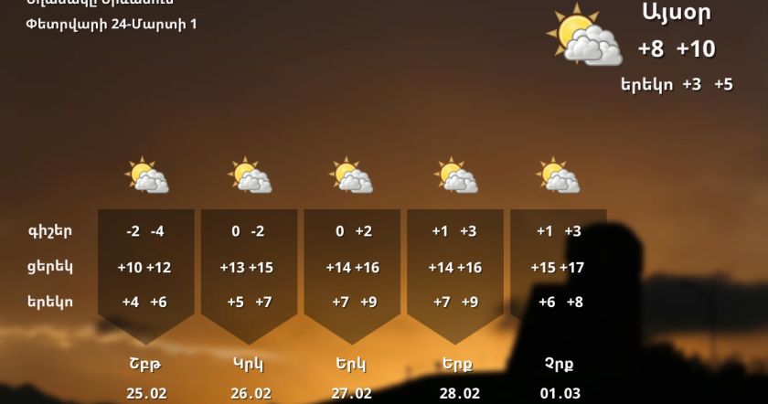 Երևանում այսօր ցերեկը, փետրվարի 25-28-ը, մարտի 1-ին սպասվում է առանց տեղումների եղանակ։