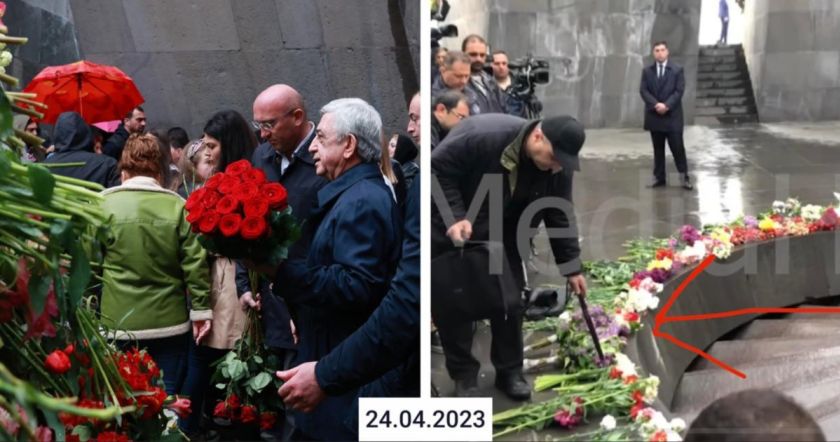 Նույն օրը նույն տեղում ծաղիկ է խոնարհում նախագահ Սերժ Սարգսյանը, որին ուղիղ 5 տարի առաջ մերժում էին (ձախ նկարում): Աջ նկարում մեծ էիֆորիայով, հեծանիվ քշելով իշխանության եկած դավաճանի համար անվտանգությունը ապահովողներն են, որոնք առավոտից ծառ ու թուփ էին ստուգում մետաղորսիչով, որ դավաճան վիժվածքը ԿԱՐՈՂԱՆԱ գալ Ծիծեռնակաբերդ: