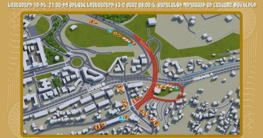 Դեֆորմացիոն կարերի վերանորոգման աշխատանքներով պայմանավորված՝ նոյեմբերի 10-ից մինչև նոյեմբերի 13-ը ժամը 06:00-ն, փակ է լինելու Սարալանջի պողոտա – Արմենակյան փողոց խաչմերուկից մինչև Սարալանջի պողոտան Հերացու փողոցին կապող ճանապարհահատվածը: